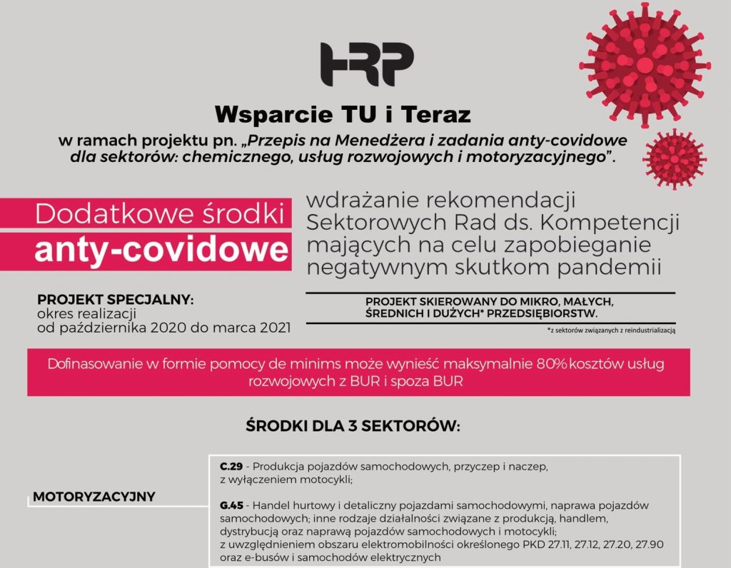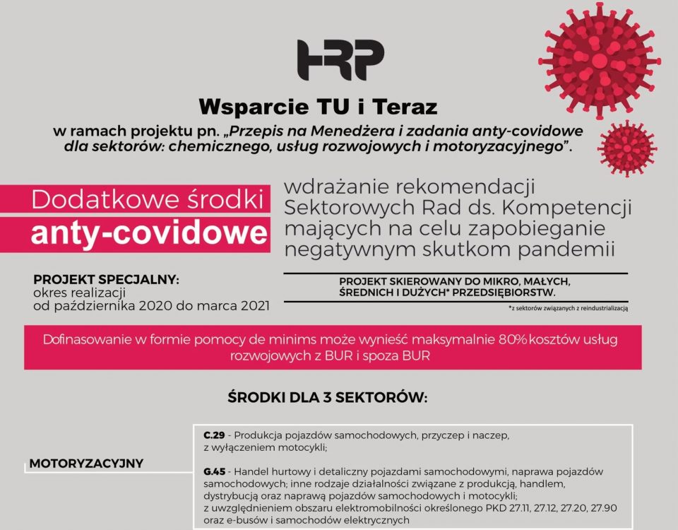 Zadania anty-covidowe są realizowane w ramach projektu pn. „Przepis na Menedżera i zadania anty-covidowe dla sektorów: chemicznego, usług rozwojowych i motoryzacyjnego” realizowanego przez Operatora HRP Group […]